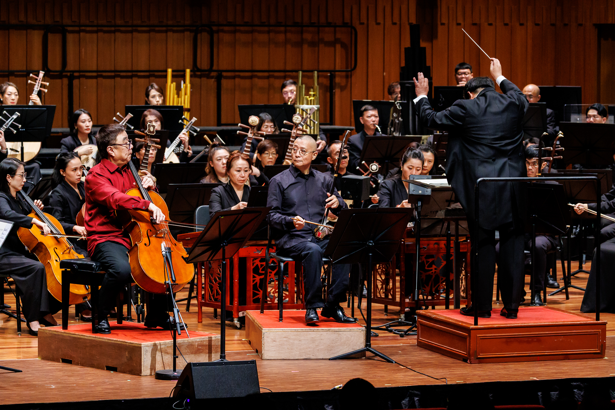 Description: (From Left to Right) Cellist Xu Zhong, Erhu Soloist Zhao Jianhua