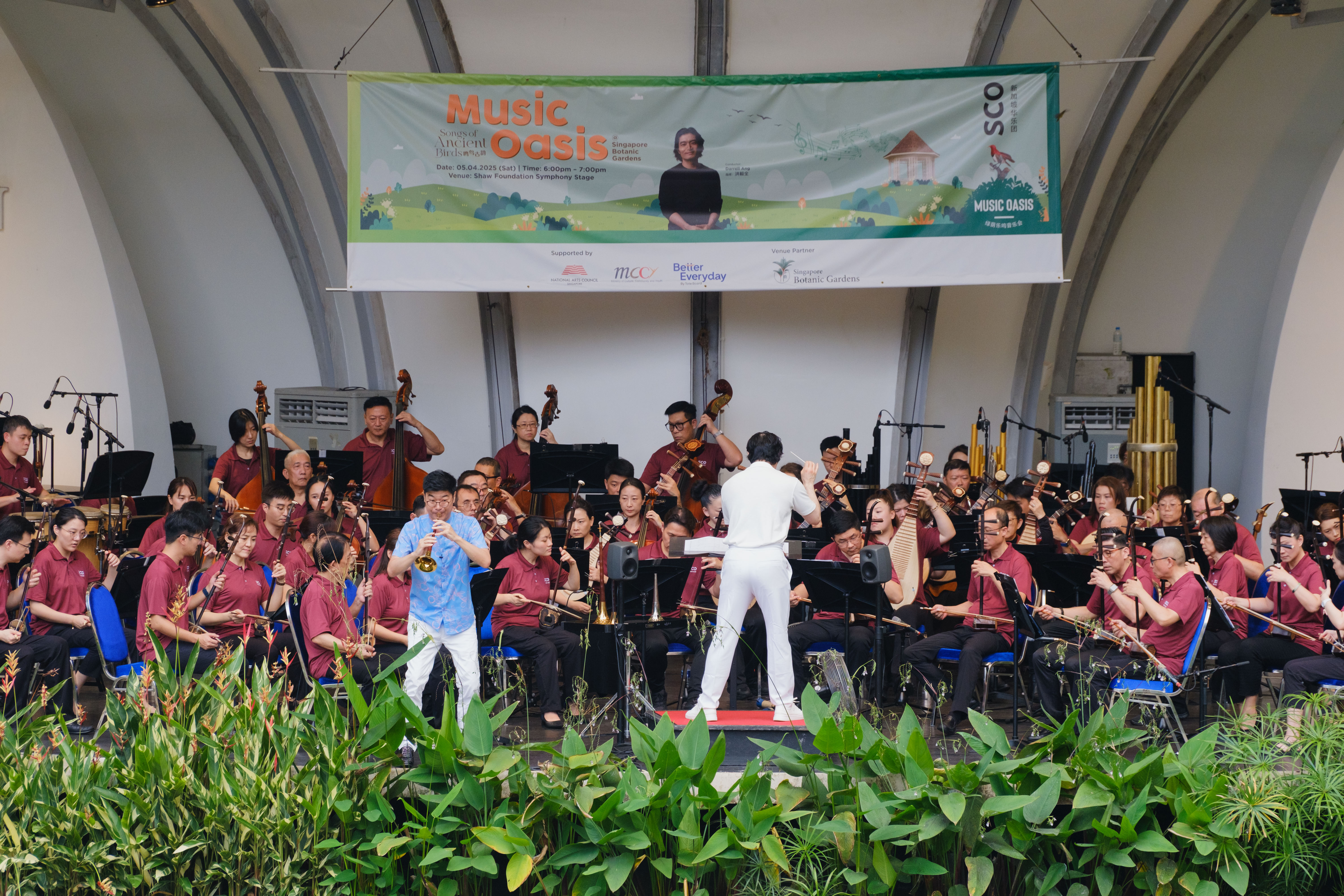 • Description: (From Left to Right) Suona Soloist Meng Jie, Conductor Darrell Ang with Singapore Chinese Orchestra in Singapore Botanic Gardens