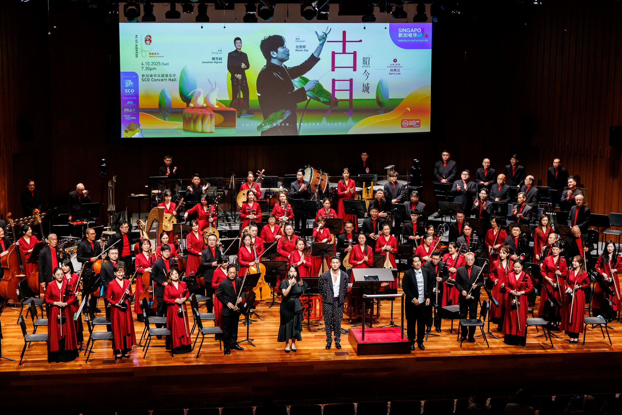简介: 新加坡华乐团与(从左到右)司仪Karin Lim、中阮独奏饒思銘、指挥倪恩辉