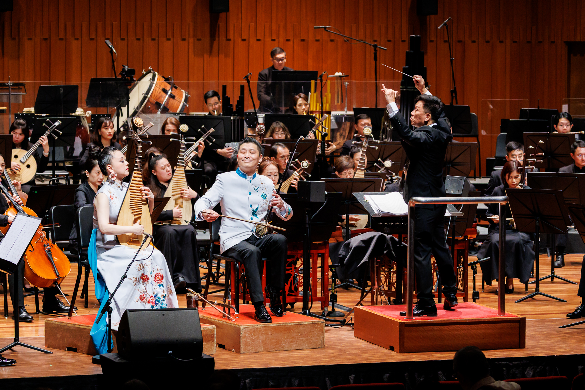 • 简介: (从左到右)琵琶独奏俞嘉 、高胡独奏黄晨达与新加坡华乐团